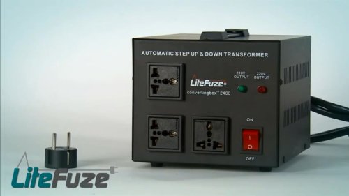 Lifetime Warranty, No Noise, More Efficient, Almost half the weight Only 18LB compared to other Voltage Transformers at this size, LiteFuze Convertingbox 2400 Watt Fully Automatic Step Up/Down voltage converter, Operates on 110/220V AC Automatically. No worries to set input voltage manually. Has a Patented universal socket outlet which means any type of plug fits into the converter. Has built in thermal fuse protection (Reset button). Efficiency Factor: 1.25, Dynamic casing design offers ventilation to the voltage transformer, Fully Grounded Transformer from Input to Output for safe operation, CE Certified, Free Euro Plug Adapter, Efficiency Factor Use this factor to calculate the correct wattage transformer needed for your items. Multiply the WATT rating on your product with this factor and purchase transformer of at least that size. Example: If your blender requires 350W, then multiply 350 x 1.25 (efficiency factor of convertingbox) = 437.5W. Thus, convertingbox 500 is recommended for this particular blender. To use multiple products, simply add watt rating of each product and multiply the combined watt rating with the efficiency factor. Always purchase a larger transformer than your appliances required wattage to handle any power surges during operation. Feel free to contact LiteFuze for more info.
